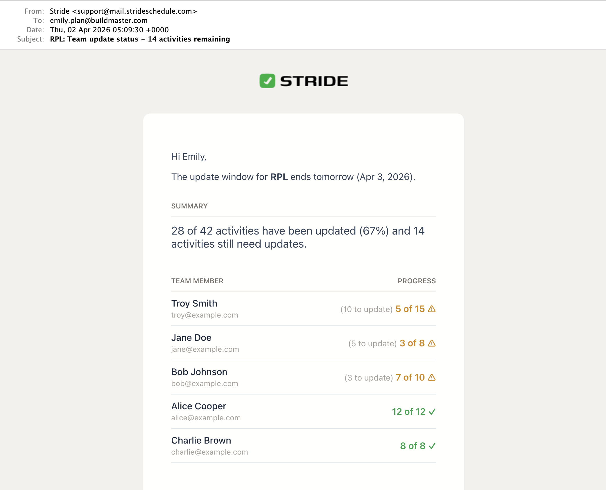 - ✓ No more nagging. Stride does the reminding, the collecting, and the P6 update.